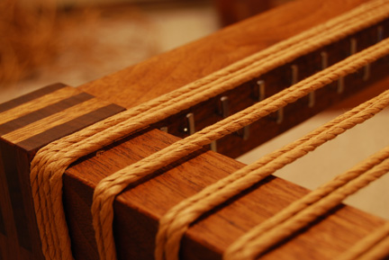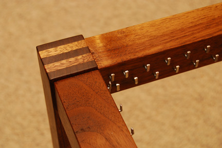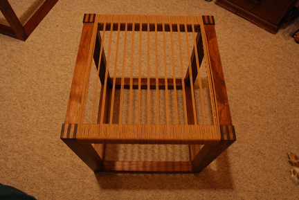 The cubes are 18 x 18 x 18 and finger jointed at the corners. Here they are during assembly in the shop and a closeup after the installation of the L-shaped danish nails ready for weaving.
